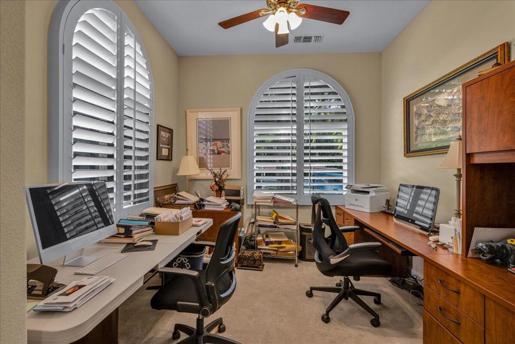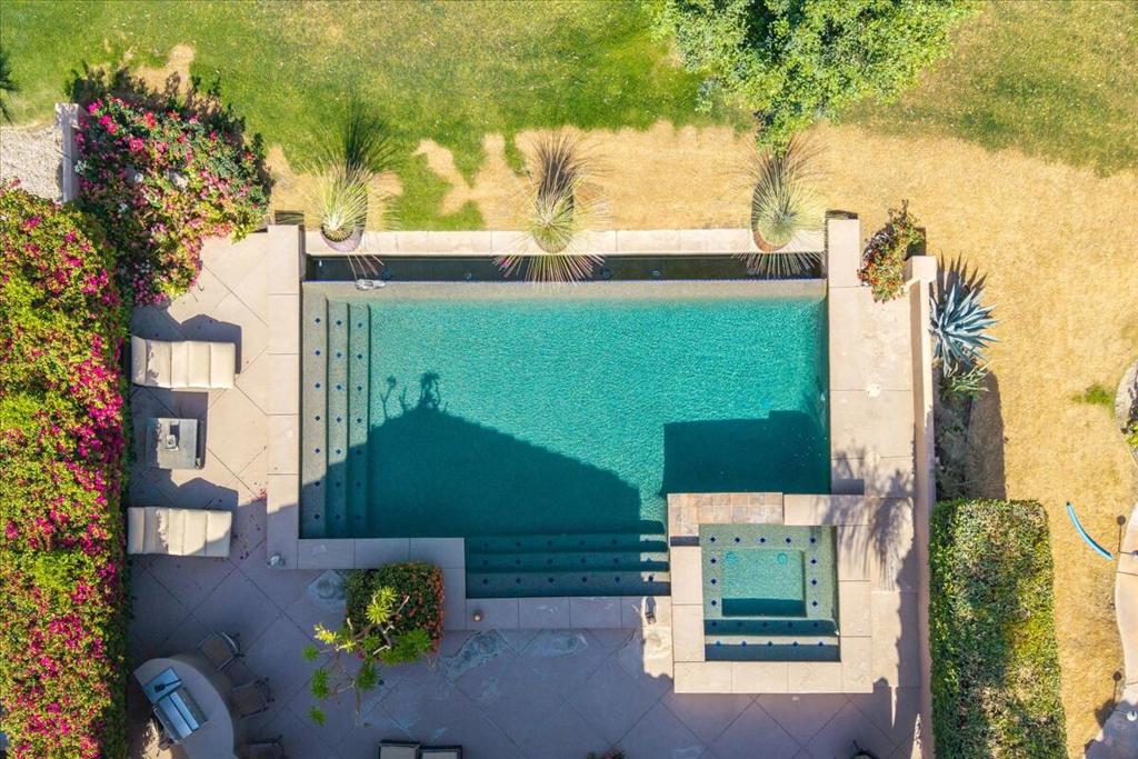 Welcome to this highly upgraded Encanto II in the sought-after Rancho La Quinta Country Club! Enter the property through a serene courtyard with a custom fountain, setting the tone for this stunning home. Inside, you'll find polished travertine flooring throughout, creating an elegant and timeless look. The remodeled kitchen is a chef's dream, equipped with custom Mahogany cabinets, Dacor double oven & cooktop, Thermador refrigerator, and Miele dishwasher. The custom cabinetry continues into the family room, which, along with the more formal living/dining area, feature cast stone-look fireplaces. The primary & guest ensuite bathrooms boast raised mahogany cabinetry and Quartz countertops from Cambria, with the primary bathroom showcasing a custom shower surround. The primary, guest, and powder rooms are adorned with custom Venetian plaster paint, adding a touch of sophistication. Recessed and art lighting throughout the home enhances the ambiance. The 2-bedroom casita with a Jack & Jill bath provides flexible space for guests. Step outside to the infinity edge pool overlooking the 14th tee box and 13th green of the Jones course with water and Mountain views. The rear yard also features a misting system and built-in BBQ. This exquisite home offers the perfect blend of luxury and comfort, making it an ideal retreat in the heart of Rancho La Quinta Country Club.